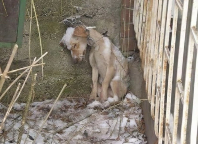 As we made our way through the snow, wrapped in warm coats and scarves, we came across a sight that stopped us in our tracks—a lone dog, chained to a crumbling wall, struggling to stand against the biting cold.